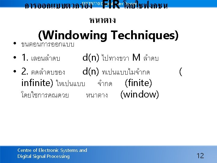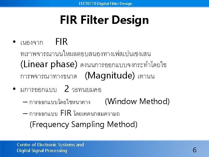 EEET 0770 Digital Filter Design ขอดของ FIR • มความเสถยร (stable) • สามารถออกแบบใหผลตอบสนองทางเฟส เปนเชงเสน (Linear phase) ไดงาย Centre of Electronic Systems and Digital Signal Processing 2