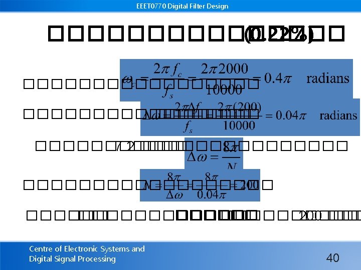 EEET 0770 Digital Filter Design ��������� =����� (Cut-off frequency) Centre of Electronic Systems and Digital Signal Processing 10