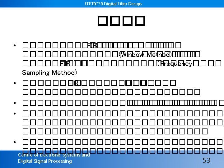 EEET 0770 Digital Filter Design �������� �� As 8. 9% 21 ������ 0. 63%44 ����� �� (Hannin g) 0. 22%53 ����� �� Centre of Electronic Systems and (Hamming) Digital Signal Processing 1 18
