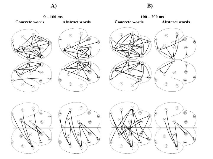 Schack’s experiment: 1. investigating alpha phase synchronization during the encoding of spoken words that subjects were instructed to remember. 2. Four lists containing either 25 concrete or 25 abstract nouns were presented • • • topographical pattern of alpha phase synchronization showed large differences between concrete and abstract words already in a very early time window of 100– 200 ms. differences in alpha phase synchronization between word categories most likely reflect differences in global categorization processes between abstract and concrete words. the speed of traveling alpha waves was faster for abstract than concrete words. Because abstract words are less numerous than concrete words, this may indicate that the search area for abstract words can be narrowed down faster for abstract then concrete words. event-related alpha coherence emerges at the time window of the P 1 and reflects the timing of co-activation between brain sites during interactive top-down and bottom-up processing