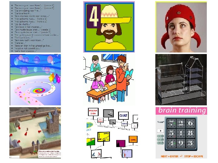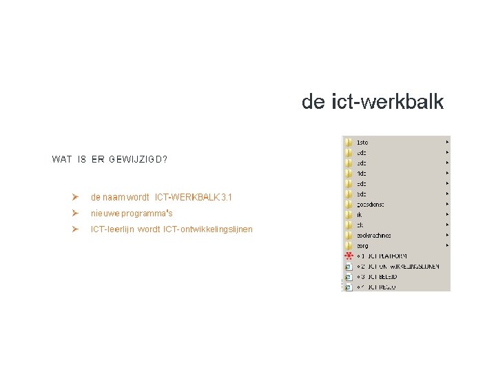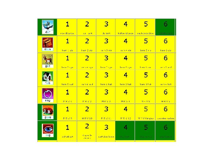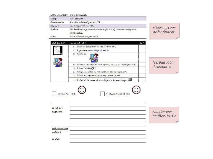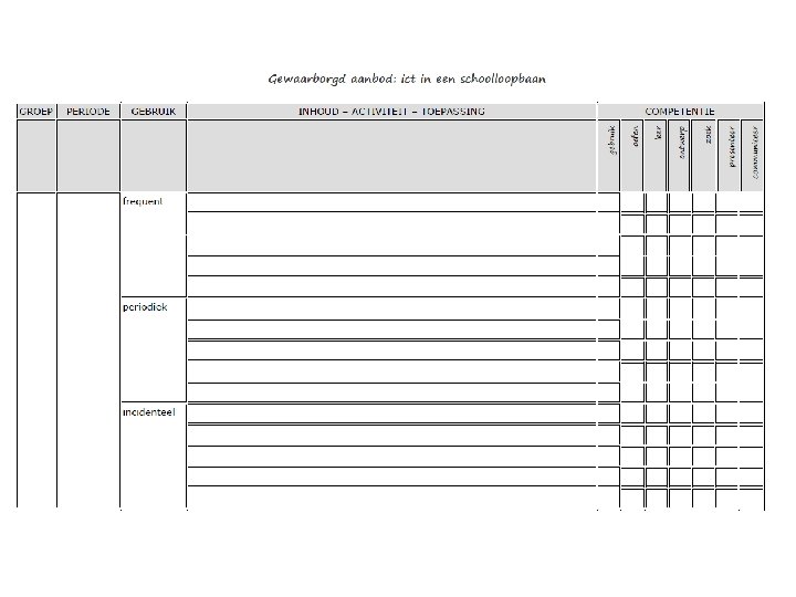 Gewaarborgd aanbod ict in een schoolloopbaan - aanvankelijk rekenen inoefenen - woordpakketten inoefenen - informatie zoeken via google - Franse woordenschat verwerven - tijdsaanduidingen leren - in- en aanzichten en berekening bij (ruimte)figuren - tafels leren - een tekst schrijven en creatief vormgeven - mijn gemeente in beeld brengen - een werothema voorstellen aan anderen - een tweetal muzische activiteiten - een presentatie bij een uitstap of bezoek - een tweetal webpaden bij een werothema - montage bij de verwerking van de openluchtklassen - virtuele verkenning in tijd en ruimte