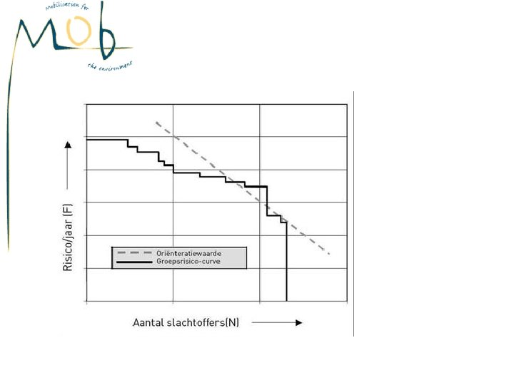 groepsrisico • cumulatieve kansen per jaar dat ten minste 10, 100 of 1000 personen overlijden als rechtstreeks gevolg van hun aanwezigheid in het invloedsgebied van een inrichting en een ongewoon voorval binnen die inrichting waarbij een gevaarlijke stof of gevaarlijke afvalstof betrokken is; • Naarmate er meer slachtoffers vallen vinden we het risico minder aanvaardbaar. • Is geen harde norm, maar een oriënterende waarde • Is één van de aspecten bij de verantwoording van het groepsrisico