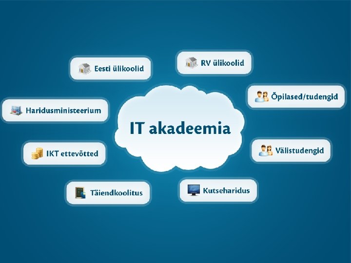 Eesti IKT sektor • Käive ca 25 miljardit IT services 17% Hardware 33% • Ettevõtteid kokku u. 2 000 (nendest >1 töötajaga 500) • 100 suuremat määravad turu (90% käibest) Telecom 50% • IT spetsialiste kokku 16 000 (sh suured IT teenuste tarbijad (pangad, riik jne))
