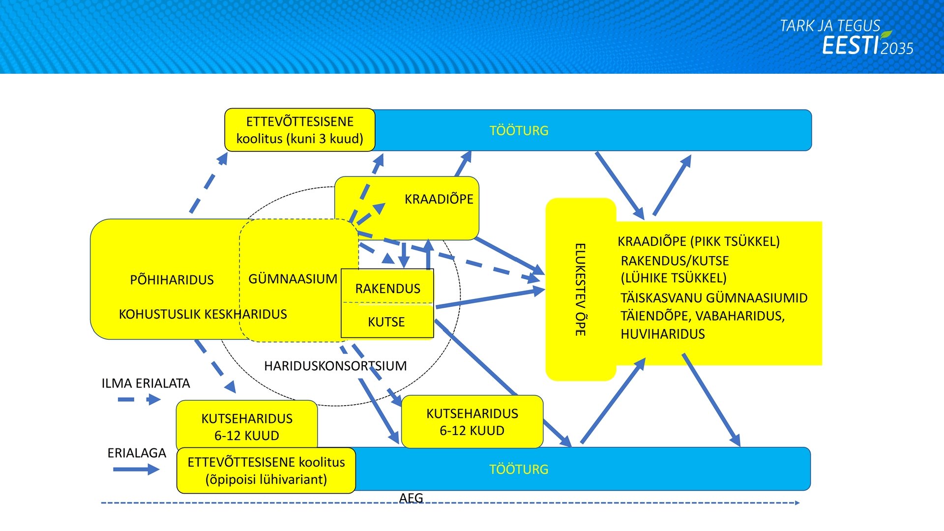 Õmblusteta haridussüsteem • Eesmärk on hariduslike tupikteede puudumine (igalt tasemelt peab olema võimalik haridusteed jätkata) ning tööjõus erialaste oskustega inimeste osakaalu tõstmine • Eriala/elukutse valikute nihutamine hilisemasse vanusesse eesmärgiga vähendada nii koolist väljalangevust kui ka töötust (madalam NEET inimeste osakaal) • Kutsehariduse taseme tõstmine rakenduskõrgharidusega samale tasemele suurendab inimeste hilisema töökarjääri võimalusi, tuleviku tööturg vajab laiemate teadmiste ja heade õpioskustega kõrgelt kvalifitseeritud oskustöötajaid ja spetsialiste