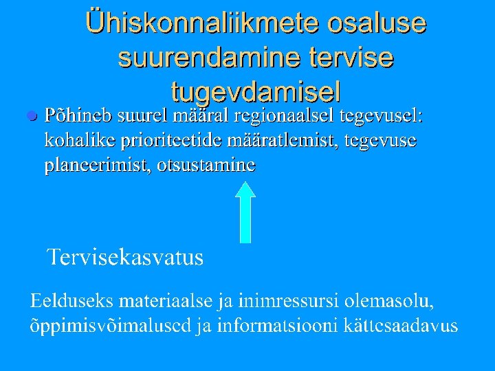 Rahva tervise parandamise väljavaated ja võimalused 1. Vaja on edasi arendada olemasolevat tervisepoliitika kontseptsiooni. Tervisestrateegia vajab edasist tööd, valitsuse heakskiitu ning koos sellega vastutajate määramist ning ressursside planeerimist tegevuste elluviimiseks. 2. Tervisepoliitika ning strateegia koostamise eelduseks on -adekvaatne terviseinfo -isikustatud andmed, regulaarselt kogutult, kaitstult -digitaalne terviselugu, luua uusi registreid -regulaarselt läbi viia terviseuuringuid -kooskõla Euroopa Liidus tunnustatud terviseindikaatoritega -longituudne lähenemisviis põhjuslike seoste selgitamiseks “Rahvatervisealane teadus- ja arendustegevuse sihtprogramm aastateks 1999 -2009” on kavandatuga võrreldes alarahastatud, mis pidurdab seatud eesmärkide täitmist.
