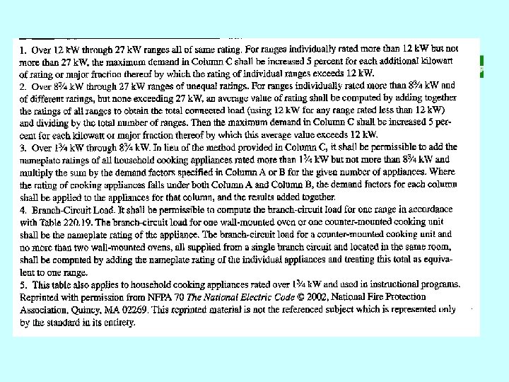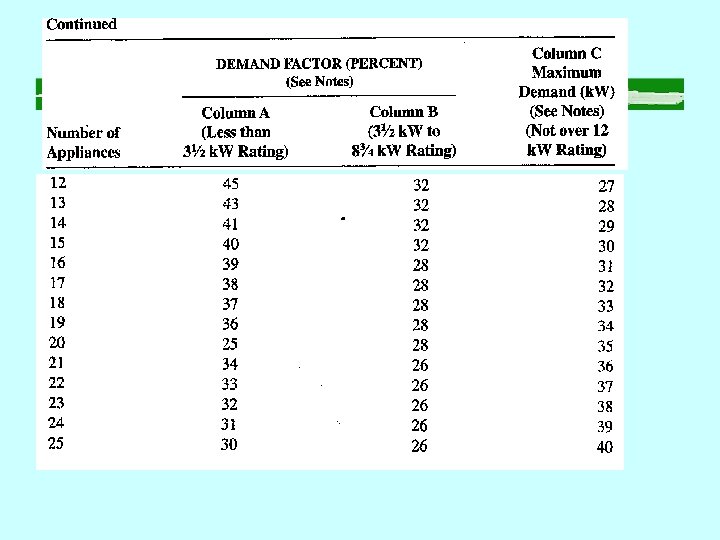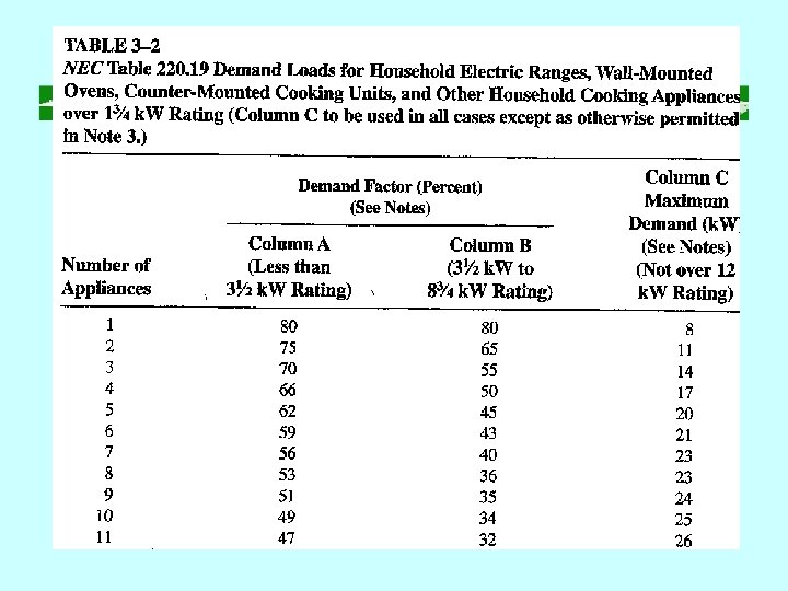 Load Estimation (cnt. ) • For the purpose of load estimation, the electric ranges are considered individually. • A counter-mounted cook-top and no more than two –wall-mounted ovens (all supplied from the same branch circuit) may be considered as a single unit for the purpose of load estimate (the ratings of units are added to determine the equivalent rating). • The demand load for household electric cooking appliances is taken from Table 220. 19 of the NEC. • For household electric ranges (or equivalent cook-top/oven) individually rated at and not over 12 k. W, the estimated demand may be determined form column A of Table 220. 19. • If the range (or equivalent cook-top/oven) has a rating over 12 k. W, but not exceeding 27 k. W, the demand from column A must be increased by 5% for each k. W in excess of 12 k. W.