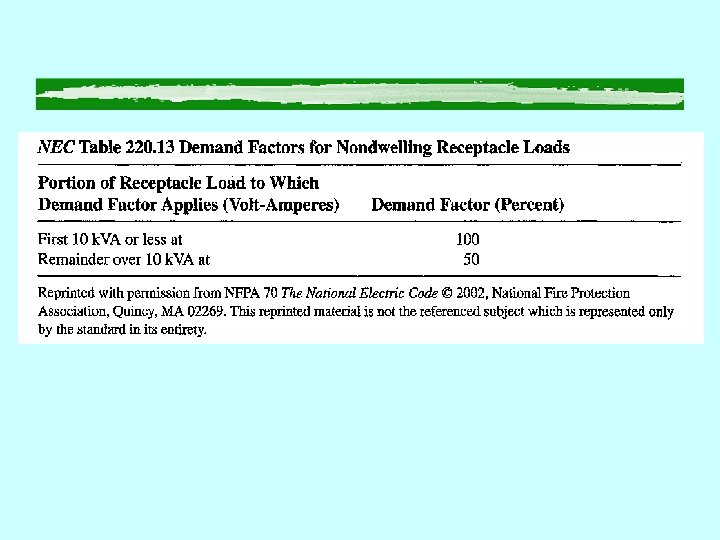 Notice: 1) Demand factors may be applied to portions of the total load due to the diversity of use that typically occurs in a particular occupancy. 2) Demand factors for general lighting loads are given in NEC Tables 220. 11 and 220. 13 (shown in Table 3 -3). Note that the use of these tables is not permitted when determining the required number of branch circuits for general lighting. These demand factors are only used to determine the total load, that typical apply only to services and feeders. 3) The lighting load that may be subject to the demand factors of Table 220. 11 is comprised of the following individual loads: a) Lighting load determined from Table 220. 3(A) b) Small-appliance branch circuit load (1500 VA each) c) Laundry circuit load (1500 VA each) d) Miscellaneous general-use receptacles that were calculated at 180 VA each