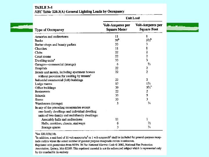 Notes: 1) Table 220. 3(A) applies to general lightning loads. 2) The load from general-purpose receptacle outlets in habitable areas of dwelling units, motels is permitted to be included with general lighting load for the purpose of load estimate. 3) For office building and banks, an additional load of 1 VA per square foot shall be included if the actual number of general-purpose receptacles is unknown. The designer may not know at the time of design what the final layout will be, so this extra provision for load must be included.