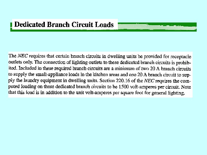 Minimum Estimated Demand Load • Accurate estimates of the demand load on a particular branch circuit, feeder, or service are necessary to determine the required rate of these circuits. • Actual number of branch circuits and feeders is also based on the determination of the estimated demand load. • The required rules for determining the minimum estimated demand load for branch circuits, feeders, and services are discussed in the Article 200 of the NEC; The basic rule is that the branch circuit, feeder, or service must have a rating sufficient to supply the demand load to be served. • The demand load on a circuit is equal to the minimum estimated load as determined by applying the NEC minimums, or the actual load, whichever is greater.