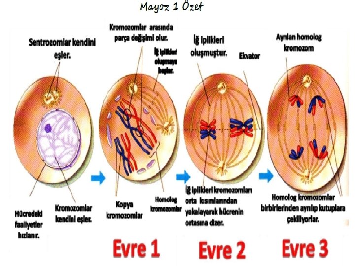 Mayoz 1 Hazırlık evresi Bu evrede şu olaylar gözlenir: ü Hücredeki kalıtsal madde iki katına çıkar, kromatin iplikler kendini eşler(kopyalar). ü Hücrenin içindeki yaşamsal faaliyetler hızlanır. ü Sentrozom (sentriol) kendini eşler(kopyalar)