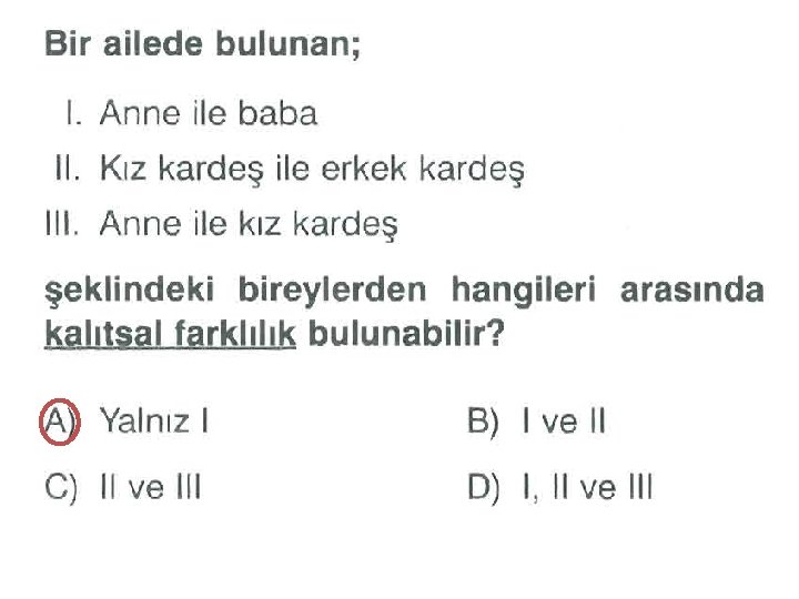 Yukarıda Ali’nin ailesindeki bireylerin dil yuvarlama veya dil yuvarlayamama durumlarını gösteren bir soyağacı yer almaktadır. Buna göre, aşağıdaki bilgilerden hangisi yanlıştır? A) Dil yuvarlama baskın bir özelliktir. B) Ali’nin dedesi homozigot baskındır. C) Ali’nin dayısı dil yuvarlama genini taşımamaktadır. D) Ali’nin annesi ve babası dil yuvarlama genini heterozigot baskın olarak taşır.