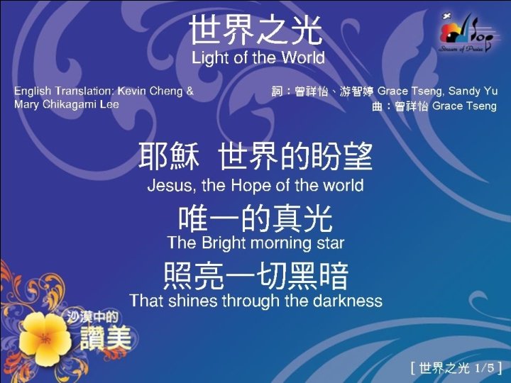2. 普世歡騰!主治萬方: Joy to the World, the Savior reigns! 萬民高聲頌揚 Let men their songs employ; 田野江河,平原,山崗 While fields and floods, rocks, hills and plains