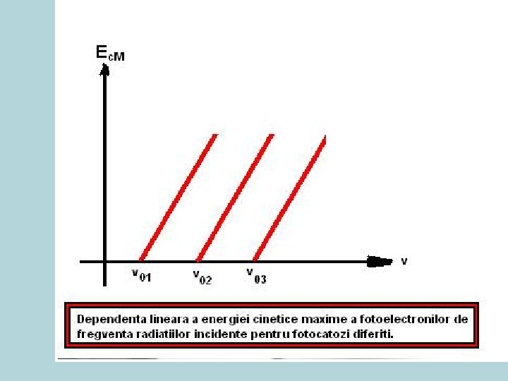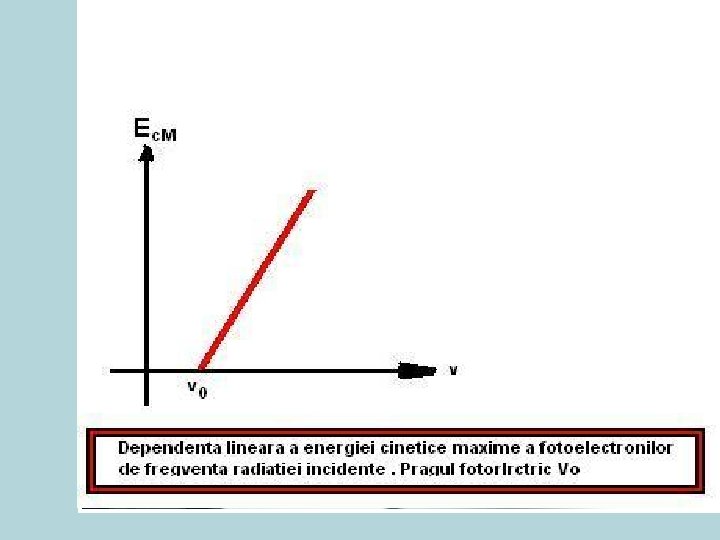 LEGILE EFECTULUI FOTOELECTRIC EXTERN • I. Intensitatea curentului fotoelectric de saturaţie este direct proporţională cu fluxul radiaţiilor electromagnetice incidente când frecvenţa este constantă. • II. Energia cinetică maximă a fotoelectroniilor este proporţională cu frecvenţa radiaţiei incidente şi nu depinde de fluxul acesteia. • III. Efectul fotoelectric extern se produce numai pentru radiaţii incidente a căror frecvenţă este mai mare decât o anumită valoare numită frecvenţă de prag. • IV. Efectul fotoelectric se produce practic instantaneu.