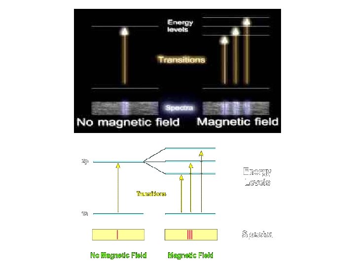 Untuk Ada 3 kemungkinan nilai energi yang dimiliki oleh elektron (tingkat energi elektron sekarang pecah menjadi 3 bagian), ini menandakan pentingnya bilangan kuantum magnetik dalam menentukan gerak orbit elektron. Pecahnya tingkat energi ini telah dibuktikan secara eksperimen oleh Zeeman. Garis spektrum yang semula 1 pecah menjadi beberapa bagian ketika atom hidrogen diberi medan magnetik kuat. Pecahnya garis spektrum ini ternyata merupakan akibat transisi dari tingkat energi yang terpecah itu
