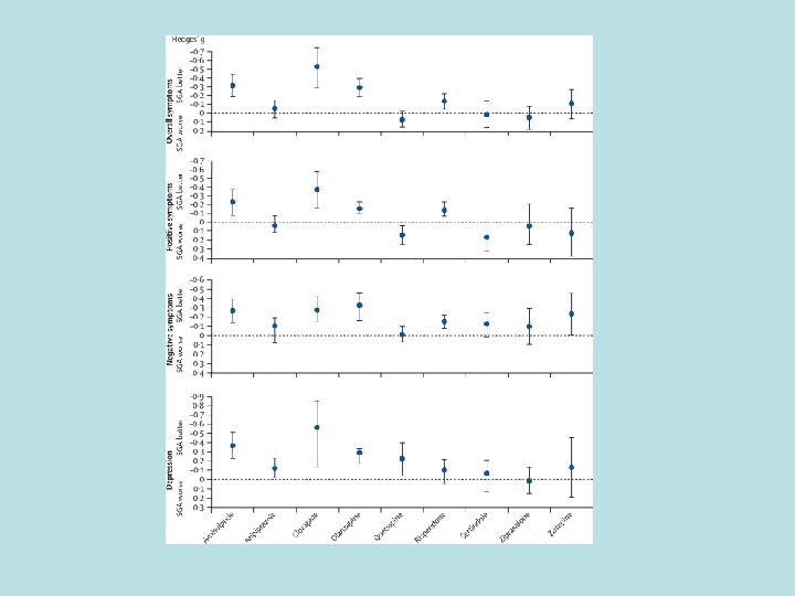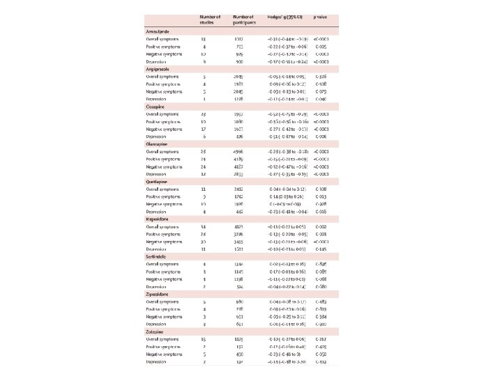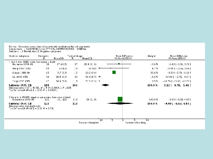 • 6 “short term” (= tot 12 wkn) studies n=236: SANS, WMD -7. 12 CI -8. 8 to -5. 5 • 1 “long term” (>26 wkn) n=235: PANNS WMD -0. 90 CI -6. 6 to 4. 8 • Zie tabel (zoz)