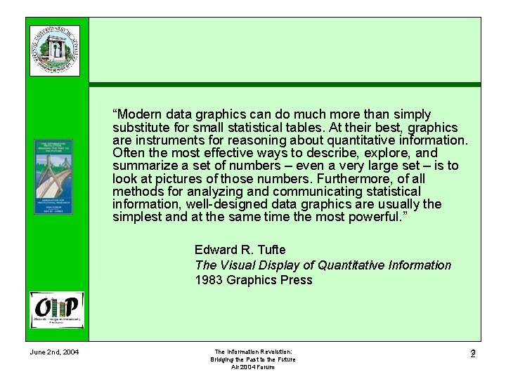 “Modern data graphics can do much more than simply substitute for small statistical tables. At their best, graphics are instruments for reasoning about quantitative information. Often the most effective ways to describe, explore, and summarize a set of numbers – even a very large set – is to look at pictures of those numbers. Furthermore, of all methods for analyzing and communicating statistical information, well-designed data graphics are usually the simplest and at the same time the most powerful. ” Edward R. Tufte The Visual Display of Quantitative Information 1983 Graphics Press June 2 nd, 2004 The Information Revolution: Bridging the Past to the Future Air 2004 Forum 22