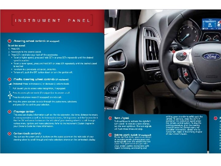 5 6 4 1 2 3 Visual Displays in your Ford Focus 1. 2. 3. 4. 5. 6. 7. Tachometer Fuel gauge Engine temperature Speedometer Dashboard information display Clock, ext. temp. , call/audio information Environmental controls 7