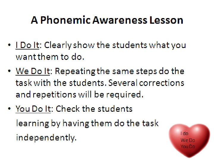 RTI/Differentiation- Reteach in Small Groups I do one We do one • Provide opportunities to practice PA with teacher support and guidance. • Integrate practice in PA throughout the curriculum and the school day. You do one