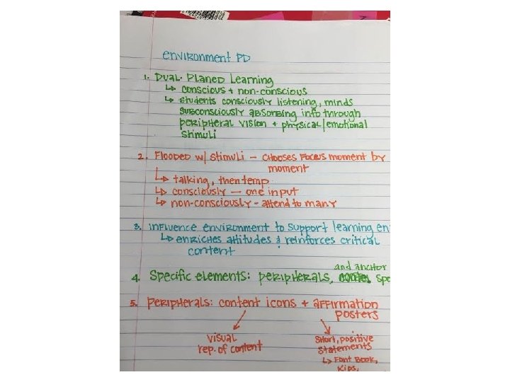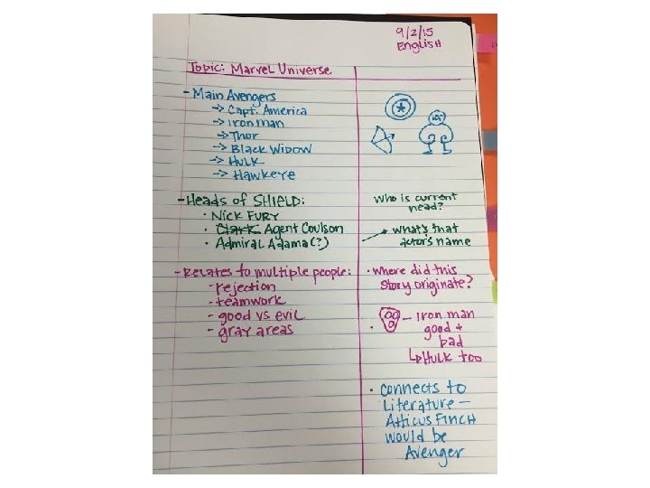 Notes TM • A cousin to Cornell Notes. • Color coded with pictures. • Two columns: – Left column—notes from text, lecture, or presentation (T= taking notes). – Right column—questions, pictures/symbols, facts in own words (M= making meaning)