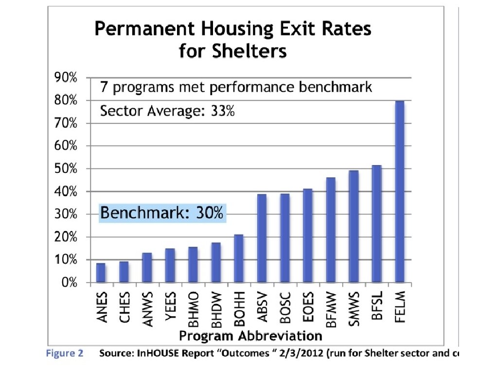What are we buying now? • Outcomes by program type, household type, and programs • Exits to permanent housing • Lengths of stay • Returns to homelessness • Source: HMIS • Cost for outcomes achieved • Source: outcome data + grants and budgets
