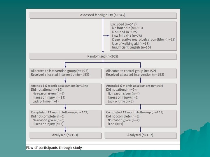 Outcomes u Primary outcome: proportion of fallers, proportion of multiple fallers and the falling rate (number of falls per participant) u Secondary outcome: foot and ankle strength, range of motion, balance and functional ability, falls risk, foot pain and disability, fear of falling and health related quality of life