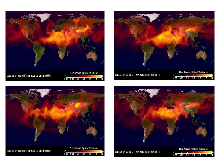 Effects of Saharan dusts on weather and climate over the Atlantic • Annual emission of Saharan dust is estimated to be 4 billion tons • Increased Saharan dust outbreak since the 1970’s, associated with the prolonged drought in Sahel and increased dust storm over the Sahara desert Possible weather and climate impacts: • SAL dry air may suppress tropical cyclogenesis, and/or hurricane formation • Microphysics effects: suppress warm rain; increase ice-nucleation and deep convection • • Solar Dimming Effect “ Elevated Heat Pump” Effect MODIS Images