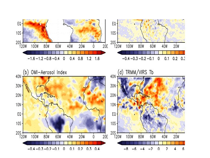 Short wave flux = -30. 4 Wm-2 Longwave flux = 5. 9 Wm-2 Sensible heat flux = 2. 1 Wm-2 Latent heat flux = 8. 6 Wm-2 Net surface flux = -14. 1 Wm-2 Estimate of anomalous (aerosol+ water cycle feedback) surface energy flux over the N. Atlantic/Caribbean region