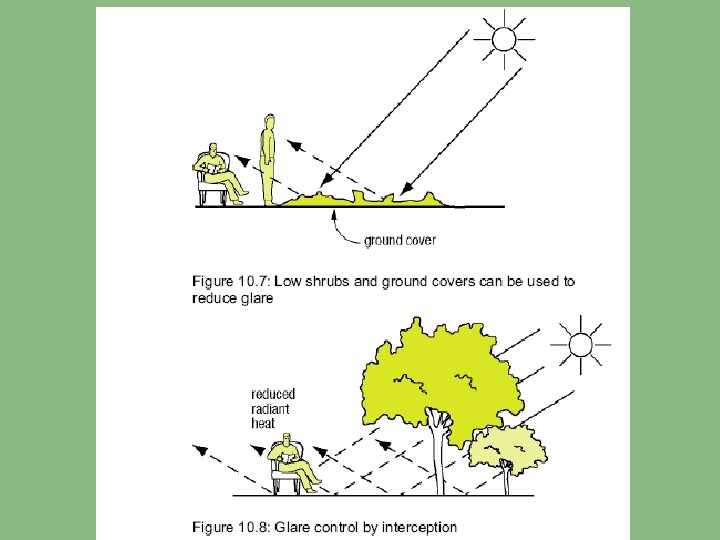 Reducing glare • Remember running barefoot across hot pavement in the summer? • Strong sunshine reflected from paving, walls, water, or shiny objects • Lawns, ground covers, low-growing shrubs absorb sunlight and re-radiate less