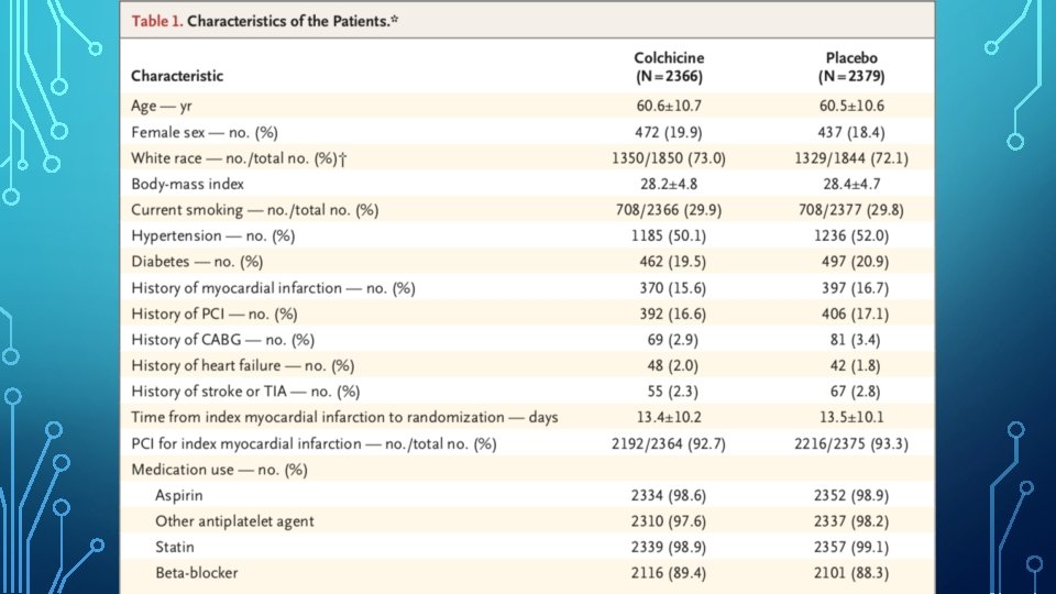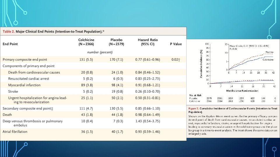 CONCLUSION • Among patients with a recent MI, colchicine at a dose of 0. 5 mg daily led to a significantly lower percentage of patients with ischaemic cardiovascular events than placebo.