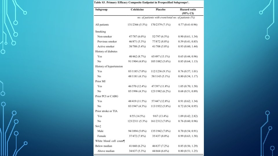 BIOMARKERS OF INFLAMMATION • hs. CRP was measured in a subgroup of only 207 patients at the time of randomization and 6 months later. • • • Median concentration at trial entry was 4. 28 mg/L. • The adjusted geometric mean percent changes in the hs. CRP level at 6 months after MI was -70% in the colchicine group and -66. 6% in the placebo group. Baselines characteristics were similar to the overall population. However, the small and selected subgroup with these data limits the interpretation of these analyses.