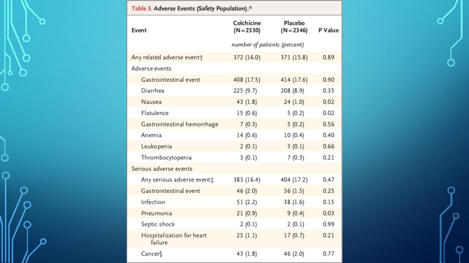 DISCUSSION • Most common adverse events observed were gastrointestinal. • Diarrhoea was reported in 9. 7% of patients in the colchicine group, vs 8. 9% in the placebo group. • Nausea occurred in 1. 8% vs 1. 0%. • Infection as a serious adverse event was more frequent in the colchicine group than in the placebo group. • • 2. 2% vs 1. 6%. Pneumonia as a serious adverse event was also more frequent in the colchicine group (0. 9% vs 0. 4%).