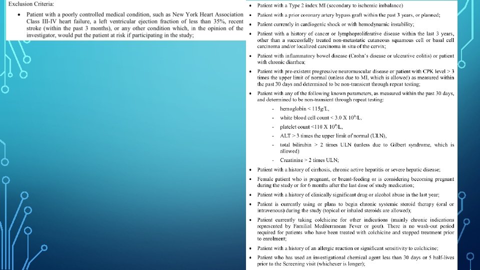 COLCOT • Colchicine Cardiovascular Outcomes Trial (COLCOT) • Aim: to evaluate the effects of colchicine on cardiovascular outcomes as well as it’s long-term safety profile in patients who had recently had a myocardial infarction. • Randomised, double-blind, placebo-controlled, investigator-initiated trial. • Patients were assigned in a 1: 1 ratio to receive either colchicine (0. 5 mg daily) or placebo. • Clinical evaluation occurred at 1 month and 3 months after randomization and every 3 months thereafter.