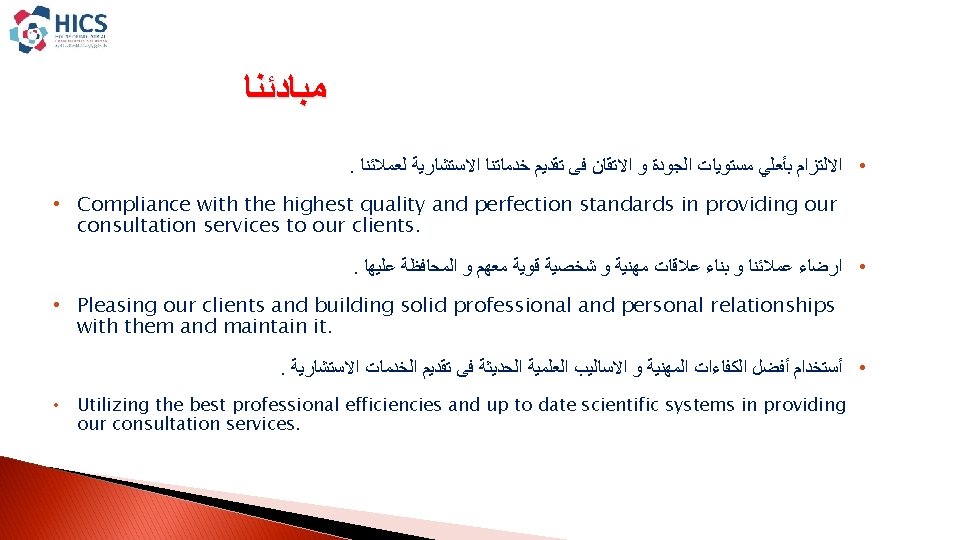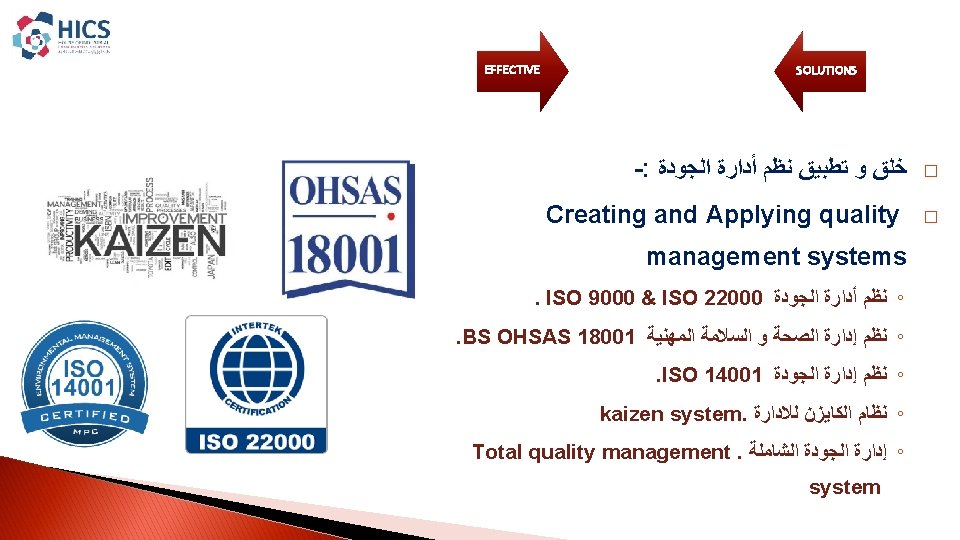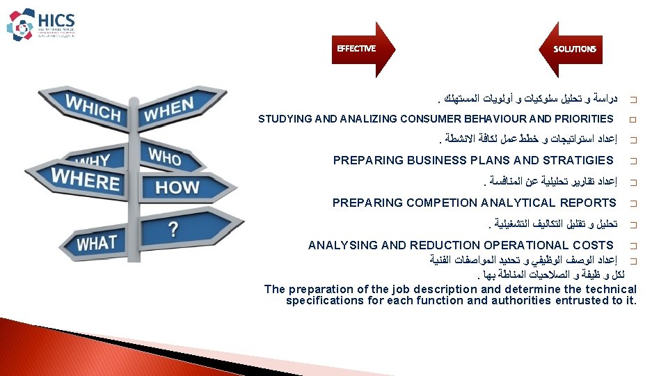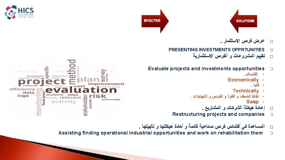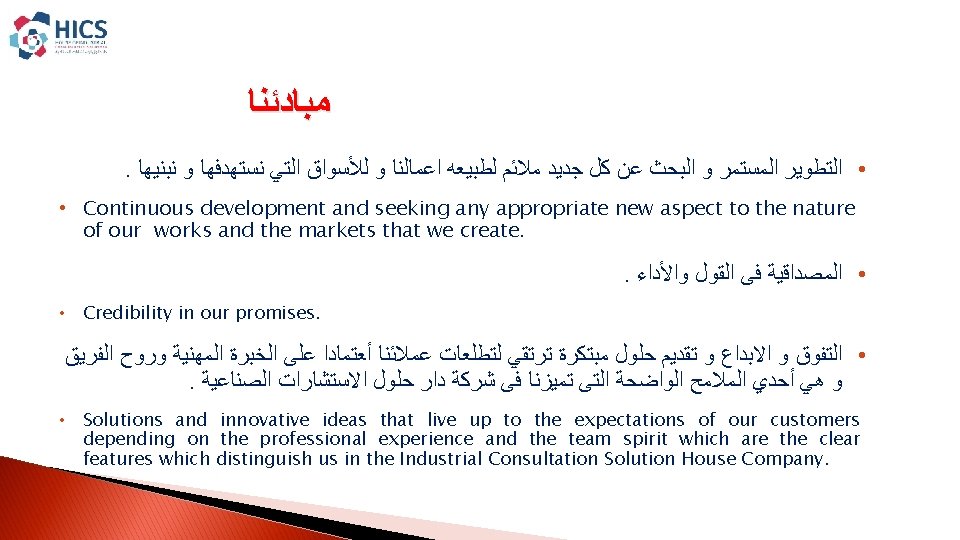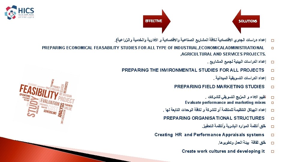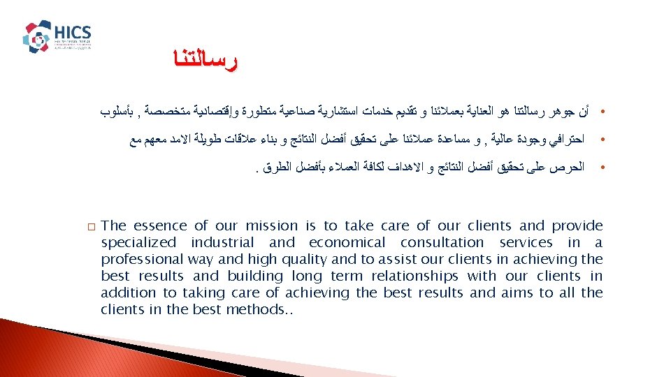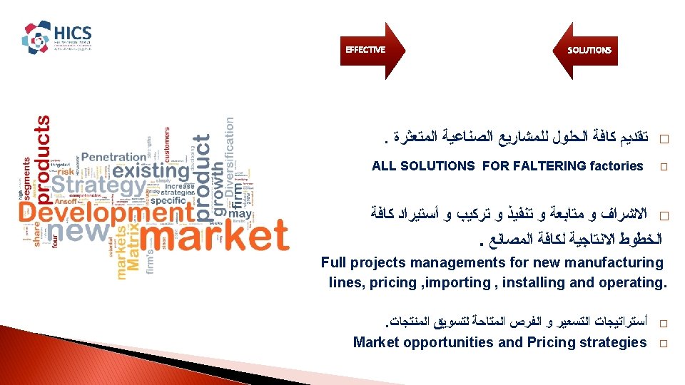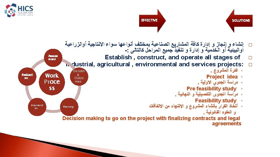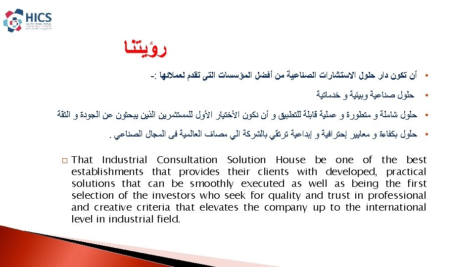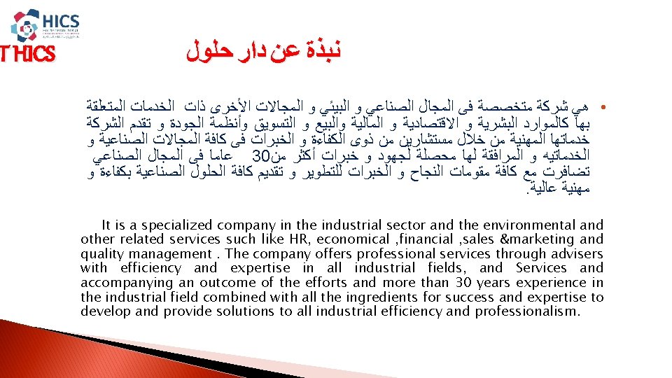 EFFICTIVE SOLUTIONS INTEGRATED INDUSTRIAL SOLUTIONS House Of Industrial Slides: 15 Download presentation EFFICTIVE SOLUTIONS INTEGRATED INDUSTRIAL SOLUTIONS House Of Industrial Consultancies Solutions ﺩﺍﺭ ﺣﻠـﻮﻝ ﺍﻷﺴﺘـــﺸﺎﺭﺍﺕ ﺍﻟﺼﻨــﺎﻋﻴﺔ ﺭﺅ ﺭﺳ ﻣﺒﺎ ﺍﻟﺨ ﺍﻟﻌﻤ Content : � � About HICS. � Our Vision. � � Our Mission. � � Our principles. � � HICS Services. � � Major Clients. HICS SERVICES EFFICTIVE SOLUTIONS