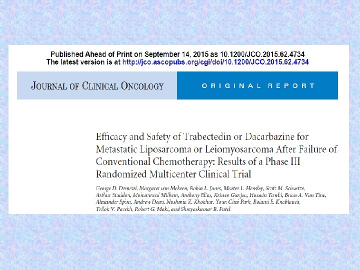 DISCUSIÓN • Existen nuevos estudios en los cuales el uso extendido de Trabectidina (más allá de los 6 ciclos) tiene beneficio. • Eventos adversos grado 3 -4 fueron > con Trabectidina pero generalmente transitorias y no acumulativos. • Requirieron retrasos o reducciones de dosis, cuidados de sostén y, en algunos casos, interrumpción del tratamiento. • Segura para > 65 años. • Este estudio, cuya SLP a los 3 y 6 meses de trabectedina (56% y 37%) confirma los resultados de un estudio previo aleatorizado de fase II (52% y 36%, respectivamente).
