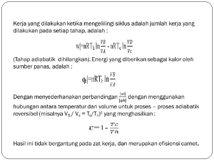 Efisiensi Mesin Kalor Efisiensi mesin kalor dapat didefinisikan sebagai perbandingan antara usaha yang dilakukan (W) dengan kalor yang diserap (Q) : Kerja maksimum yang dapat dilakukan oleh mesin adalah :