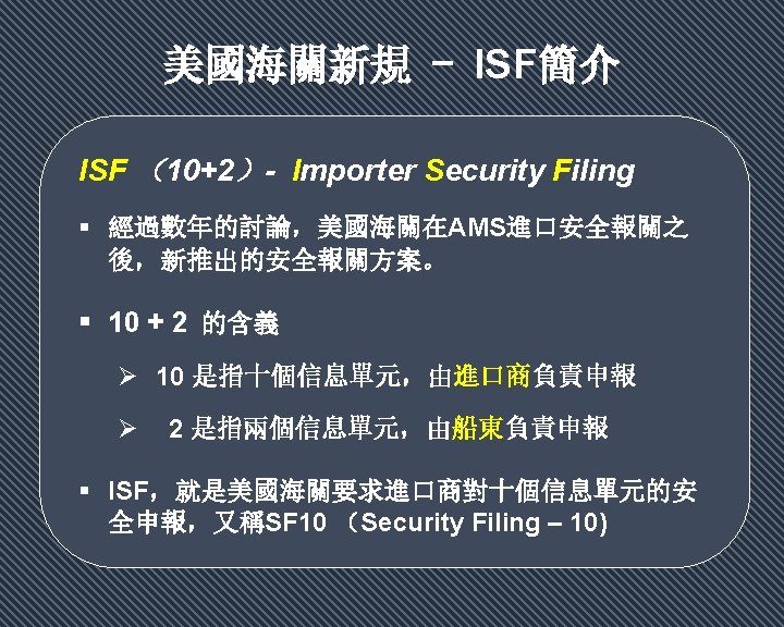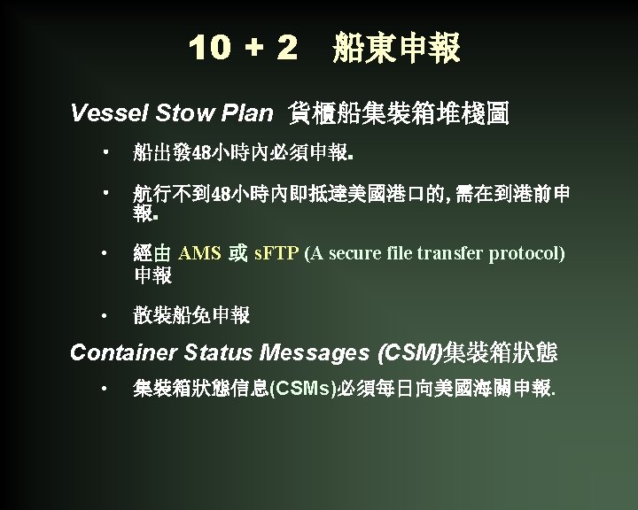 ISF 過渡時期條款 - 彈性申報(1) Ø 下面八個信息必須在登船 24小時前發送 1. 2. 3. 4. 5. 6. 7. 8. Seller Buyer Importer of record number Consignee Number Manufacturer Ship to party Country of origin Harmonized Tariff Schedule (HTSUS) Ø 彈性條款: 另外兩個可以在到港 24小時前發送 9. Container stuffing location 10. Consolidator (stuffer)