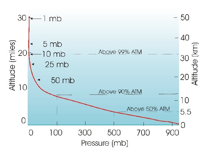 Relationship between pressure and height • As we climb in elevation (up a mountain or in a hot air balloon) fewer air molecules are above us: atmospheric pressure always decreases with increasing height