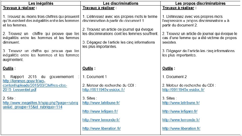 Synthèse : 1. Définition égalité, inégalité, discrimination et propos discriminatoire 2. Montrer que les femmes sont victimes d’inégalités, de discriminations et de propos discriminatoires