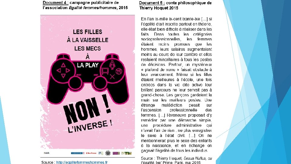 Mise en situation de la séance 1 Problématique : les femmes sont-elles égales aux hommes aujourd’hui ? Pour répondre à cette question, les élèves, par groupe de trois, réalisent un dossier documentaire qu’ils présentent à l’oral.