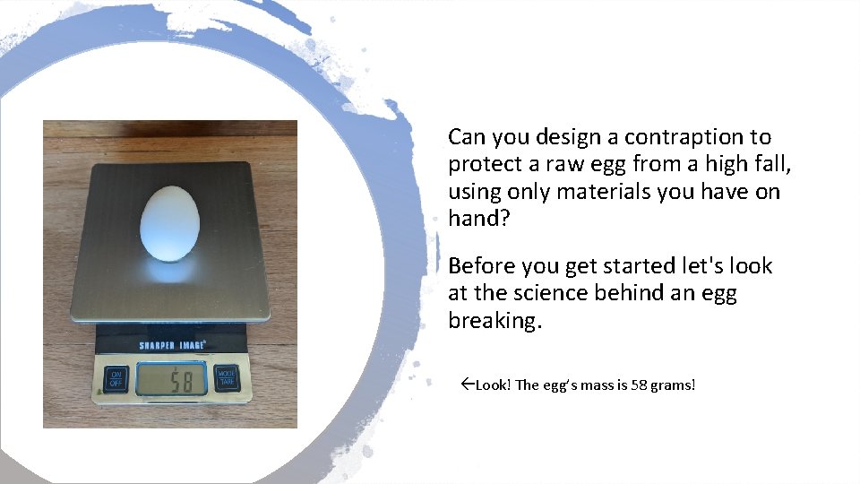 Can you design a contraption to protect a raw egg from a high fall, using only materials you have on hand? Before you get started let's look at the science behind an egg breaking. Look! The egg’s mass is 58 grams!
