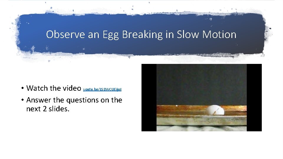 Observe an Egg Breaking in Slow Motion • Watch the video youtu. be/LS 8 WCUEijo. I • Answer the questions on the next 2 slides.