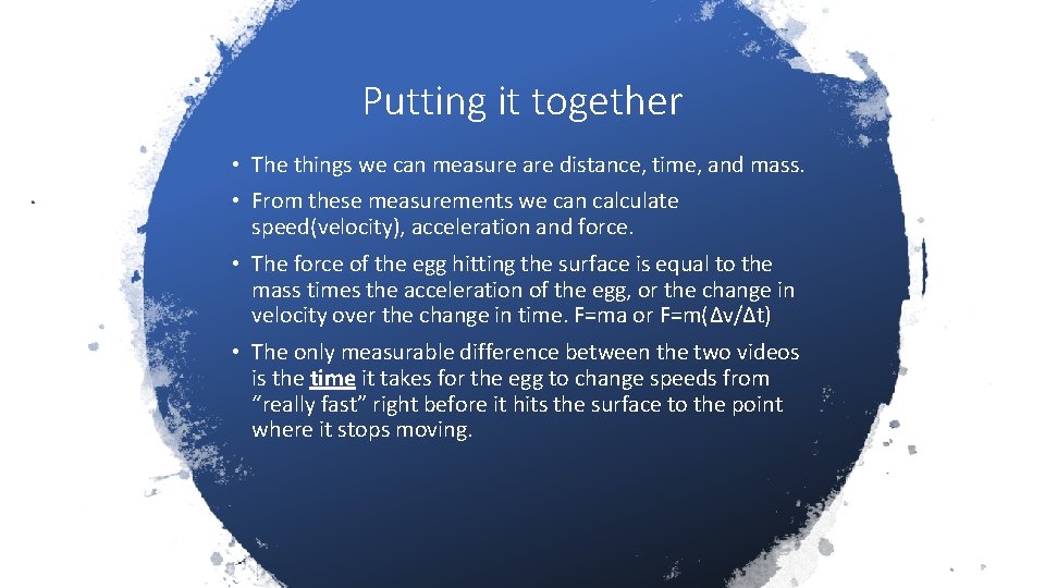 Putting it together • The things we can measure are distance, time, and mass. • From these measurements we can calculate speed(velocity), acceleration and force. • The force of the egg hitting the surface is equal to the mass times the acceleration of the egg, or the change in velocity over the change in time. F=ma or F=m(Δv/Δt) • The only measurable difference between the two videos is the time it takes for the egg to change speeds from “really fast” right before it hits the surface to the point where it stops moving.