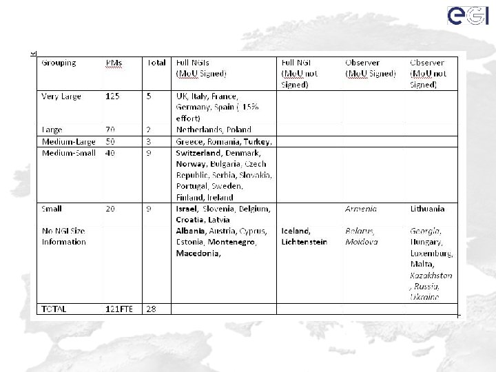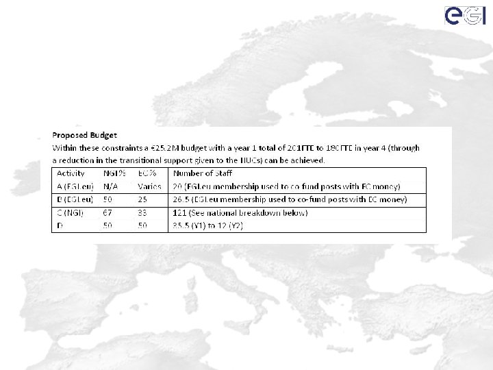 NGI Budget Data • Input from 31 NGIs • Uncorrected International Tasks – 7 (Armenia) 360 (Italy) PM a year – Total 2848 PM (237 FTE) a year • Bids reviewed to assess reasonable effort – Decided a ‘reasonable’ level of effort – 7 (Armenia) 190 (Italy) PM a year – Total 2281 PM (190 FTE) a year