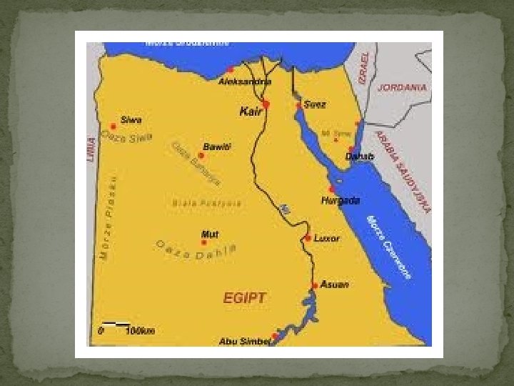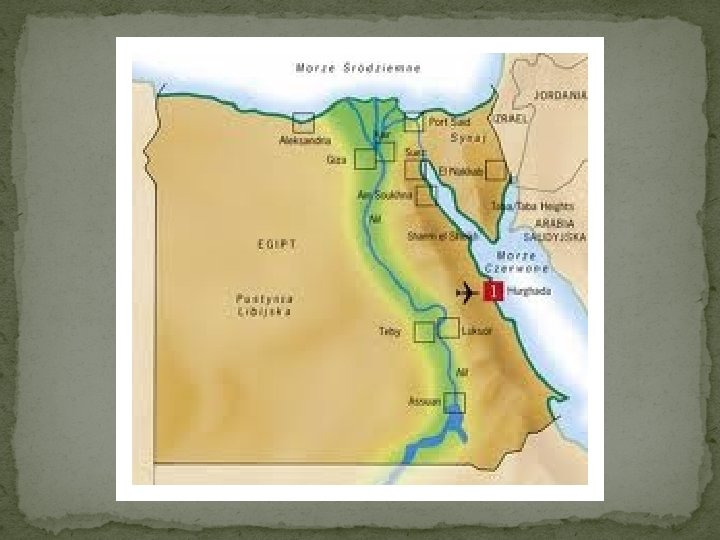EGIPT Państwo położone w północnowschodniej Afryce z półwyspem Synaj w zachodniej Azji. Egipt graniczy z Izraelem i Strefą Gazy na północnym wschodzie, Sudanem na południu i Libią na zachodzie. Od północy rozpościera się Morze Śródziemne a na wschodzie Morze Czerwone .