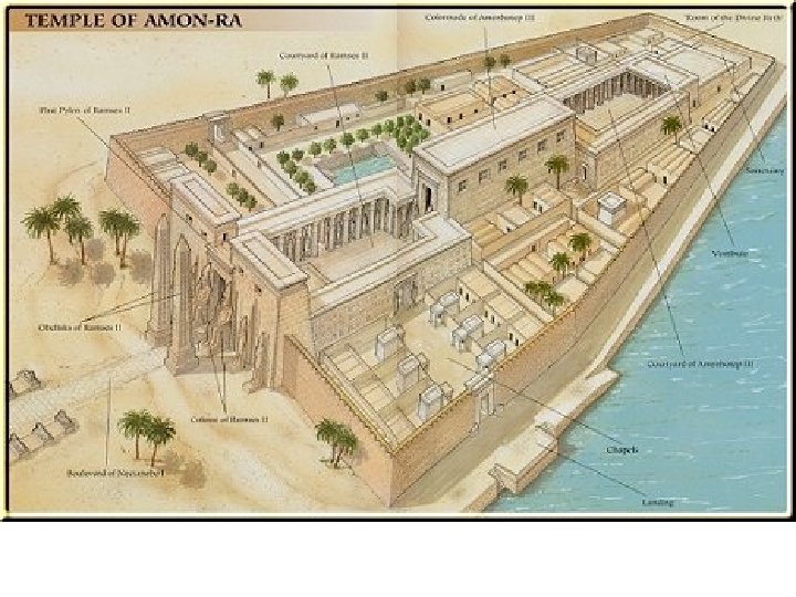 Los templos egipcios Eran construidos para ser morada de los dioses. Su plano general obedece al de una “vía iniciática” (un camino hacia el o los dioses). Conforme avanzamos, el espacio se va haciendo más sagrado. Paralelamente, las estancias van siendo menos luminosas. Y el acceso se va restringiendo.