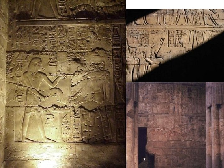 La arquitectura Construyen en piedra. Al principio lo habían hecho con árboles. Por eso, copiarán con la piedra una palmera, o flores de loto, papiro, … Hoy se ha perdido aquella arquitectura original. Levantan inmensos edificios sin notarse ningún defecto. Dos imágenes del Templo de Philae