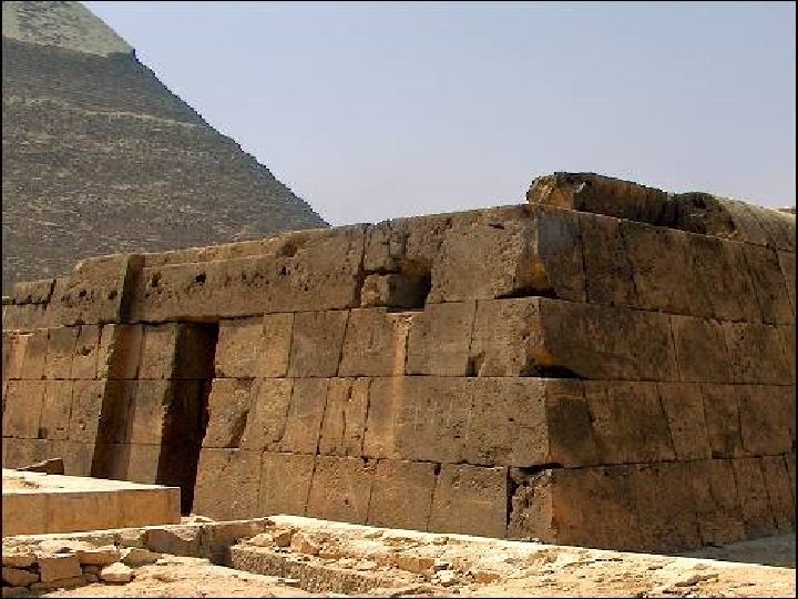 Mastabas � Tumbas destinadas a enterrar al faraón e importantes funcionarios � Tenía forma de pirámide cortada por la parte superior. � Poseía una sala de ofrendas con una estatua del difunto. � Tenía una cámara subterránea donde se depositaba el cadáver.