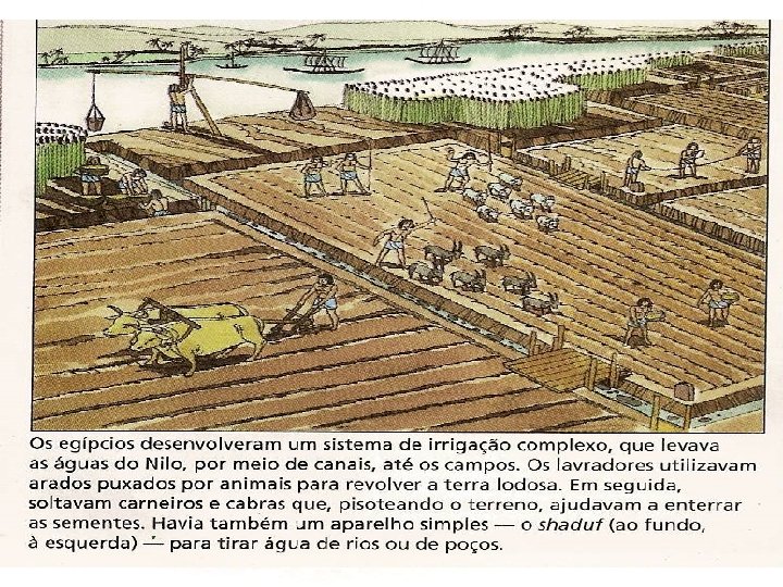 ORGANIZAÇÃO ECONÔMICA � � A agricultura era a base da economia egípcia e, como já vimos, dependia das águas do Nilo. O trigo, a cevada, os legumes e as uvas constituíam as principais culturas. O Comércio e o artesanato eram desenvolvidos através da troca