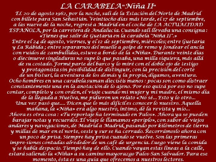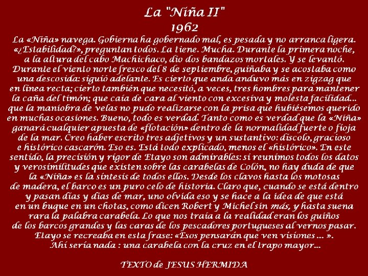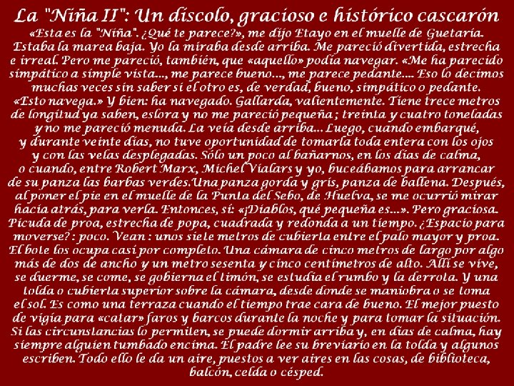 La Niña, littéralement « l'enfant » , est une des caravelles de la première expédition de Christophe Colomb en Amérique, avec la Pinta et la caraque Santa Maria, découvrant la première route allerretour entre le Nouveau Monde et l‘Europe. La nef surnommée aussi Sainte Claire, était la plus petite des trois, pouvant déplacer jusqu'à 20 hommes d'équipage et 50 tonneaux. Les caravelles étaient protégées par un secret d'État au Portugal car selon la volonté du roi Jean II, ces navires ne pouvaient être vendus ou prêtés aux étrangers sans son autorisation. Sous le commandement du capitaine Vicente Yàñez Pinzon, elle quitta le port de Palos de la Frontera la nuit du 3 août 1492. Christophe Colomb lui-même prend son commandement pour le voyage de retour en compagnie de la Pinta, mais une tempête les sépare de celle-ci avant d'arriver à Lisbonne le 4 mars 1493. Robert F. Marx est l'un des pionniers américains de plongée sous-marine et est mieux connu pour son travail sur les naufrages. Marx se spécialise dans la plongée en 1953 et en a pratiqué plus de 5 000. et est l'auteur de plus de 800 rapports ou articles et de 59 livres sur l'histoire, l'archéologie, des naufrages et l'exploration des épaves. Il a été membre fondateur du Conseil sur l'archéologie subaquatique et de la Société de recherche sur la mer. En 1972, participé à la création du diplôme professionnel américain de docteur en histoire marine. Marx a été fait Chevalier de l‘Ordre d’Isabelle la Catholique par le gouvernement espagnol pour sa reconstitution de la Niña, caravelle de la première expédition de Christophe Colomb.