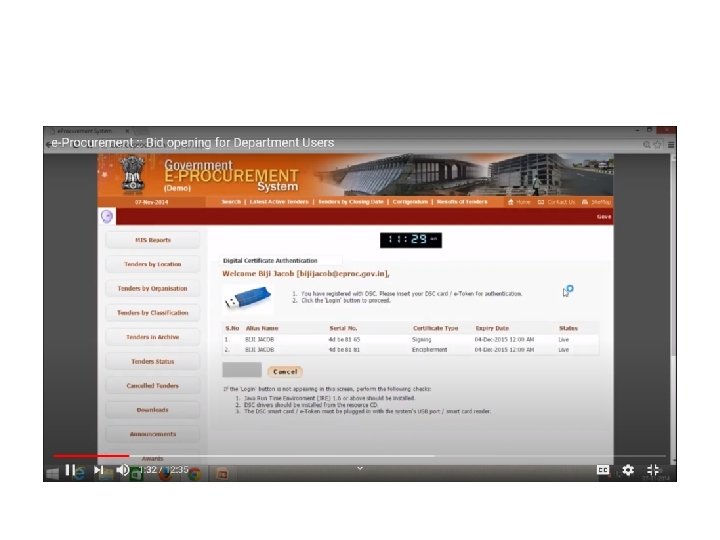 • Login as one of the authorized bid openers Use dsc digital signature certificate (usb drive)